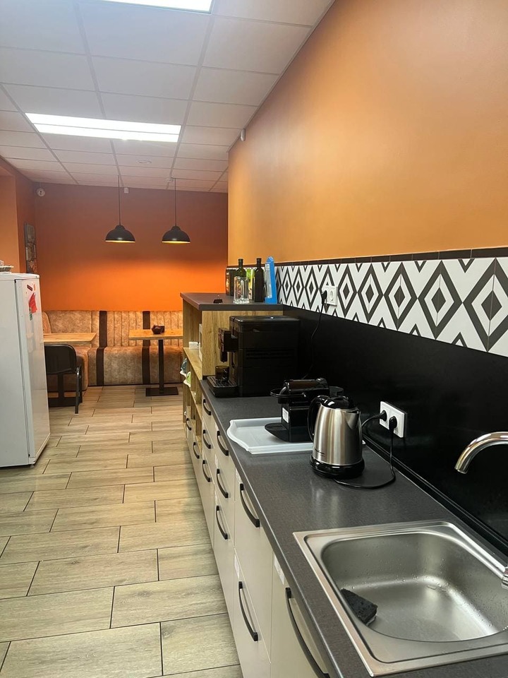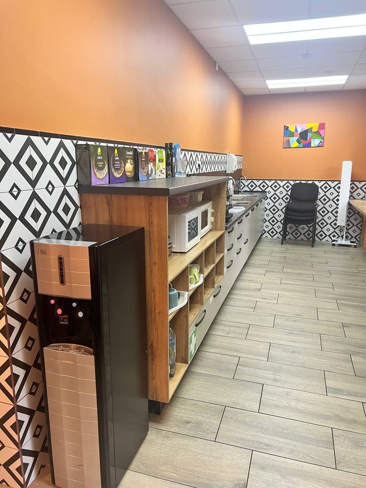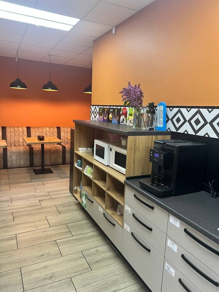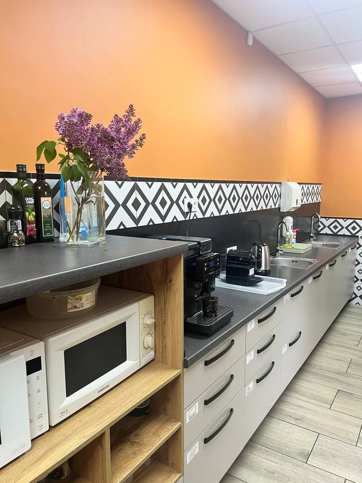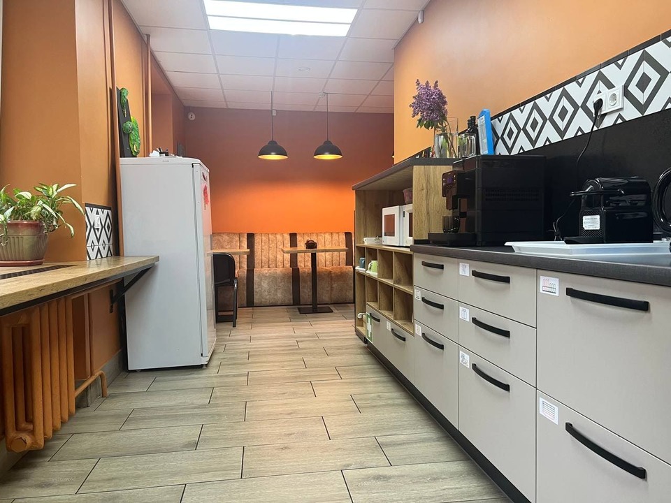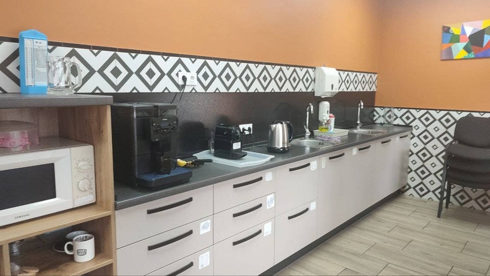 Здесь есть всё, чтобы перекусить с комфортом: чайник, кофемашина, холодильник, две микроволновки, кулер с горячей и холодной водой. У нас всегда под рукой тарелки, кружки, ножи, разделочные доски и даже одноразовая посуда — удобно и практично.