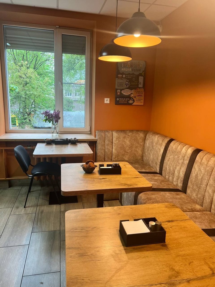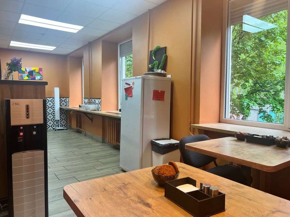 А ещё — мягкий диван, столики и стулья для неспешных обедов и перерывов в хорошей компании. На стене — картина, которую мы нарисовали вместе. Это не просто декор, а настоящий символ командного духа.