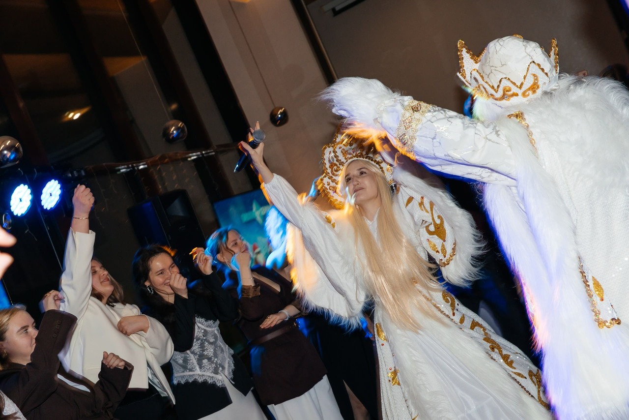 Праздник начался эффектно — с зеркального шоу. Артисты поразили гостей яркими образами и зажигательными выступлениями на барабанах, задав праздничному вечеру динамичный ритм. После этого к мероприятию присоединился ведущий, который сразу вовлёк всех в атмосферу веселья и новогоднего настроения.