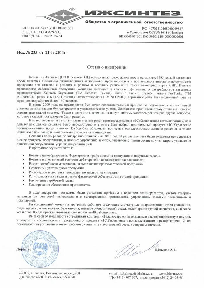 Компания Ижсинтез (ИП Шестаков В.Н.) осуществляет свою деятельность на рынке с 1995 года. В настоящее время являемся динамично развивающимся и надежным производителем и поставщиком широкого ассортимента продукции для отделки и ремонта в родном и соседних регионах, а также некоторых стран СНГ. Помимо производства собственной продукции, компания выступает в качестве официального дистрибьютора известных производителей: Хенкель Баутехник (ТМ Церезит, Томзит), Поли-Р, Спектр, Строби, Алина РосТрейд (ТМ АLINEKC), Трейси и К (ТМ Позитив), Экспертэкология (ТМ NEOMID), Герметик-Трейд. На сегодняшний день на предприятии работает более 150 человек.