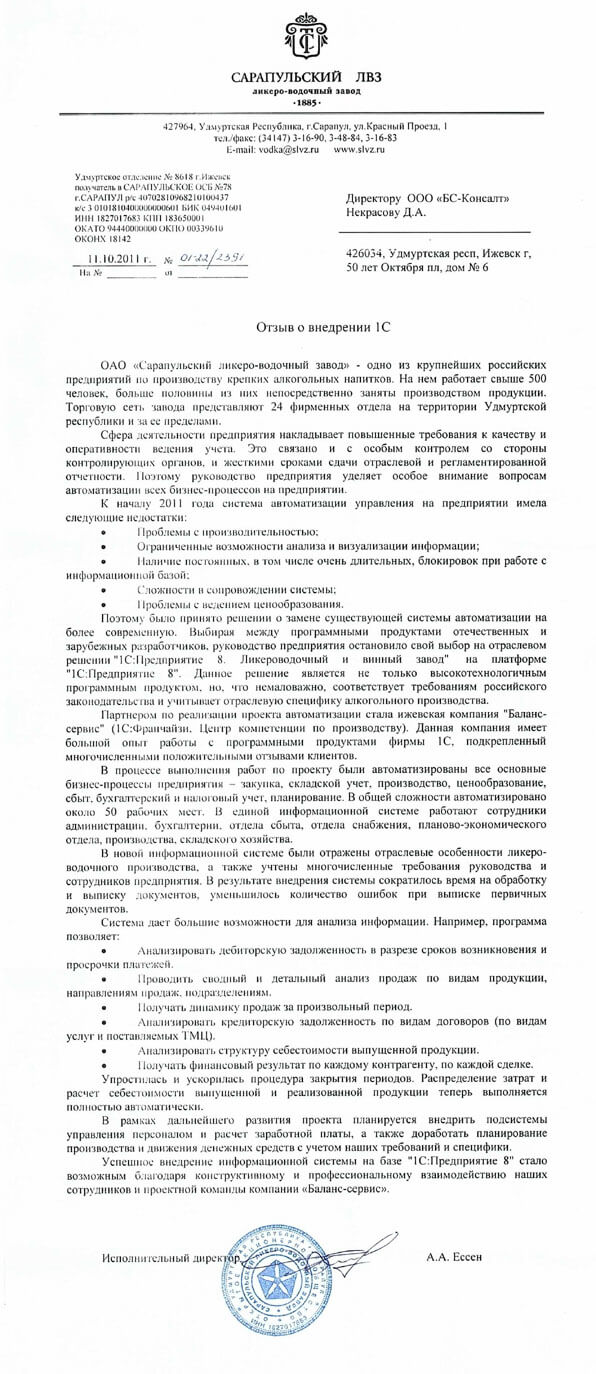 Партнером по реализации проекта автоматизации стала ижевская компании "Баланс-сервис" (1С:Франчайзи, Центр компетенции по производству). Данная компания имеет большой опыт работы с программными продуктами фирмы 1С, подкрепленный многочисленными положительными отзывами клиентов.